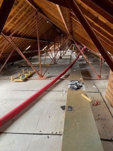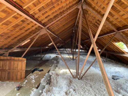 Ces combles étaient remplis d’un isolant projeté ancien, extrêmement volatile et potentiellement dangereux pour la santé. Une évacuation est habituellement pénible, poussiéreuse et très exposante pour les compagnons.